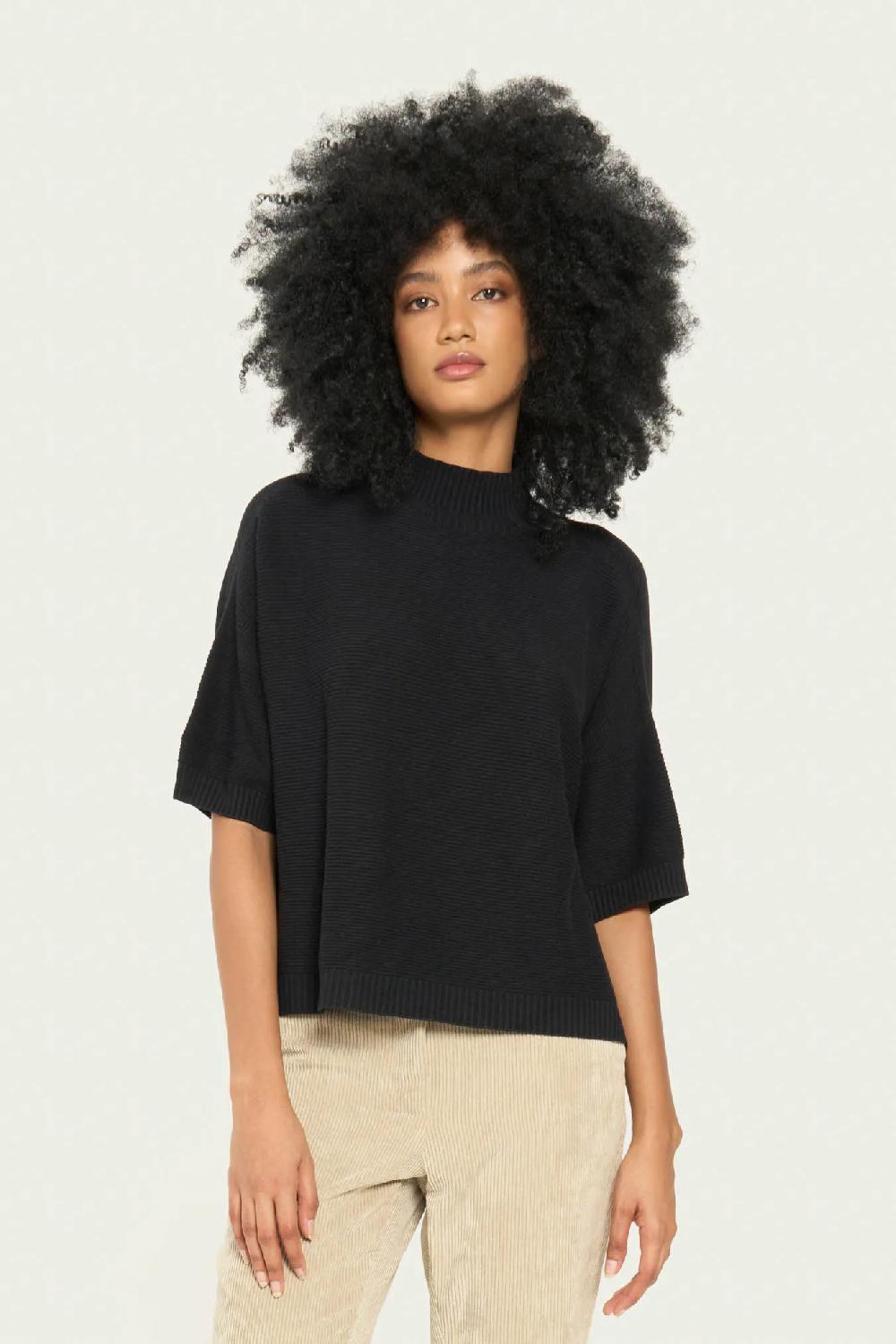 Maglia a scatoletta in viscosa crépe di alta qualità, caratterizzata da un tocco elegante dato dal collo a cratere a coste e alla manica a palloncino corta.